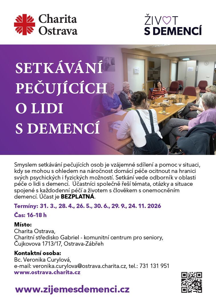 Člověk pečující v domácím prostředí o svého blízkého, který trpí onemocněním demencí, se může ocitnout na hranici svých psychických i fyzických možností. Pomocí může být sdílení náročnosti domácí péče s dalšími lidmi, kteří jsou v obdobné situaci. Srdečně Vás zveme na pravidelná, bezplatná Setkávání pečujících, která vede odborník v oblasti péče o lidi s demencí. Účastníci podpůrné skupiny řeší témata spojená s každodenní péčí a životem s člověkem s onemocněním demencí. Nejbližší termín setkání 28. 4., 26. 5., 30. 6. 2026, 16–18 h, místo a kontakt: Charita Ostrava – Charitní středisko Gabriel – komunitní centrum pro seniory, Čujkovova 1713/17, 703 00 Ostrava-Zábřeh, Bc. Kamil Kopřiva, DiS., e-mail: kamil.kopriva@ostrava.charita.cz, mobil: 739 323 933, web: www.ostrava.charita.cz